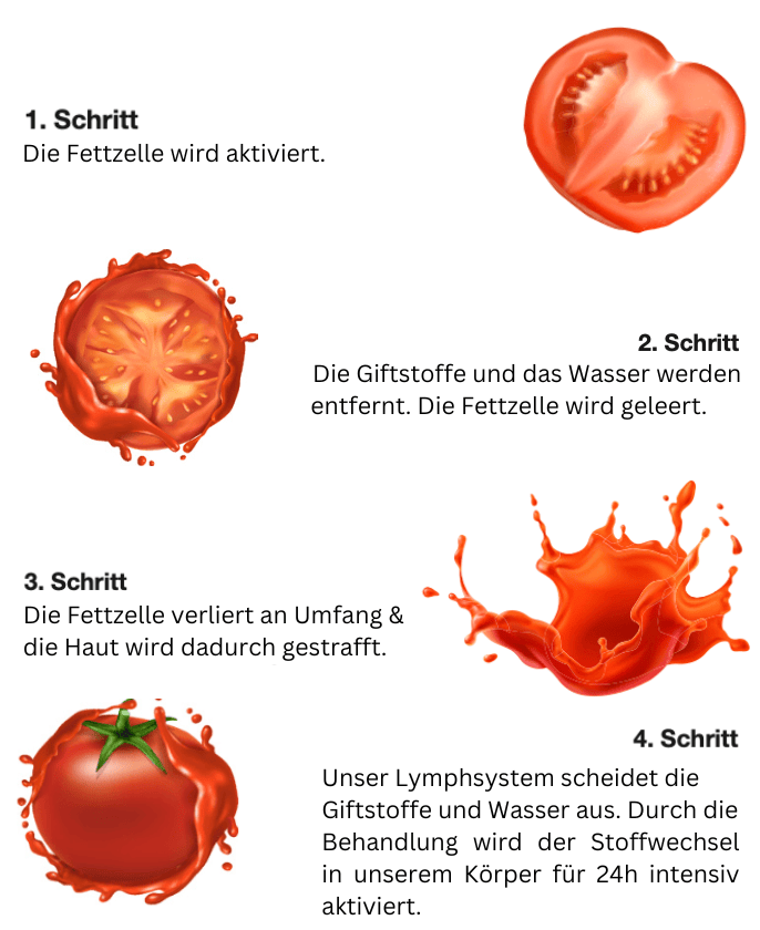 *Achtung! Die Fettzelle wird weder verletzt noch zerstört. Lediglich der Stoffwechsel der Fettzelle wird "aufgeweckt", damit der natürliche Fettabbau wieder ablaufen kann. Die Darstellung der Fettzelle dient ausschließlich der einfachen bildlichen Veranschaulichung. Eine Gewichtsreduktion auf der Waage setzt eine dafür geeignete Ernährung voraus.